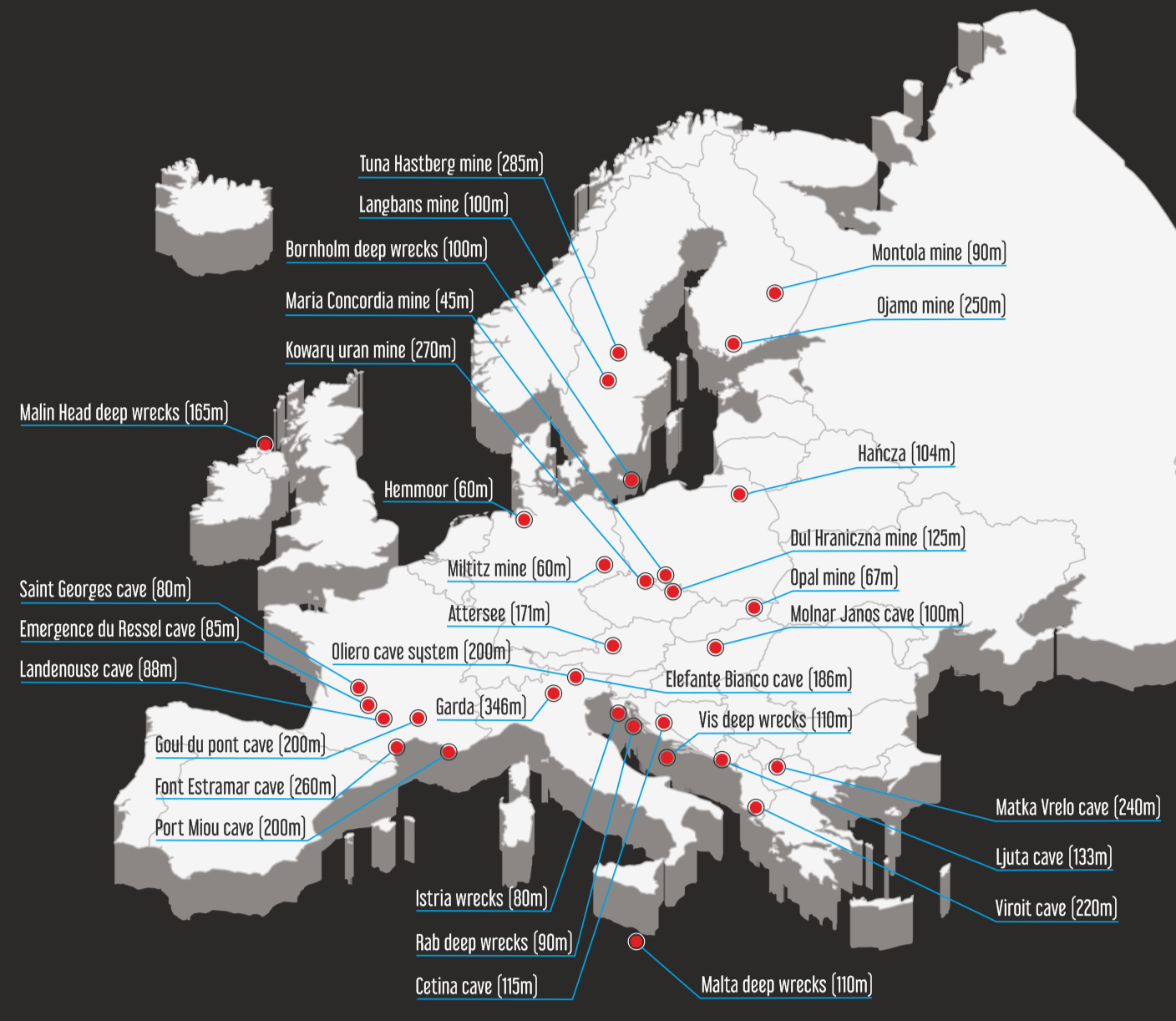 Poniżej prezentowana mapa zawiera chyba najbardziej popularne miejsca nurkowe w Europie - w przeszło 95% z nich miałem okazję nurkować!